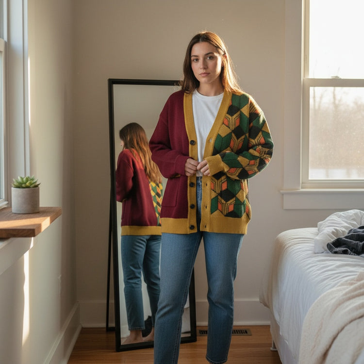 From convention halls to cozy evenings, see how fans are styling their Demon Slayer Cardigan. Each shot highlights the cardigan's relaxed fit and vibrant design.